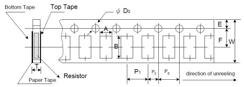 | Type | A (mm) | B (mm) | W (mm) | E (mm) | F (mm) | P0 (mm) | P1 (mm) | P2 (mm) | ØD0 (mm) | T (mm) |