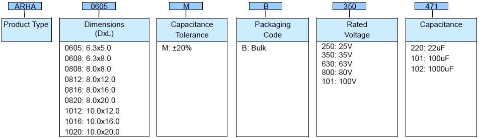Conductive Polymer Aluminum Solid Electrolytic Capacitors - ARHA Series - Product Identification