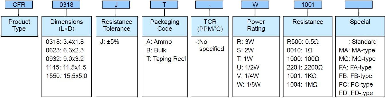 | CFR0318 | 0318 | 1/8W ~ 1/4W | ± 5% | 0.1Ω ~ 10MΩ |