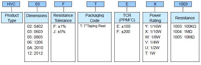 | HVC03 (0603) | 1/10W | 200V | 400V | 56KΩ - 1MΩ | ±100 | ||