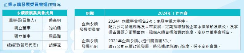 本委员会下设立企业永续经营小组,以确保企业永续发展相关工作的推动与落实,并由委员会指派管理代表,负责向董事会报告。