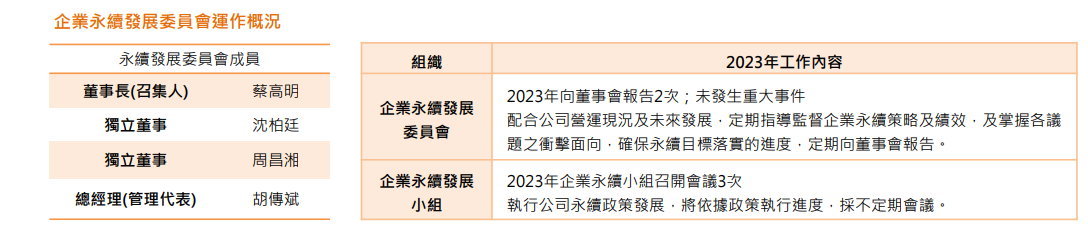 本委員會下設立企業永續經營小組,以確保企業永續發展相關工作的推動與落實,並由委員會指派管理代表,負責向董事會報告。