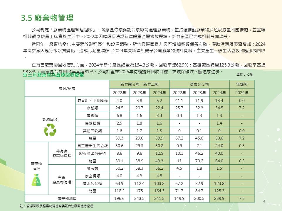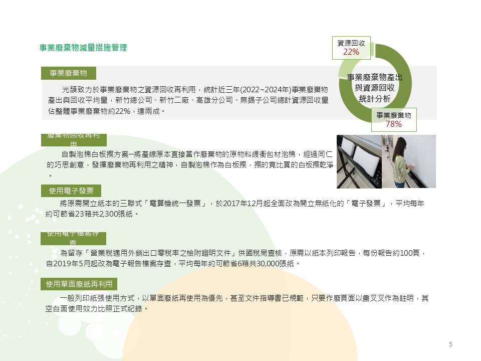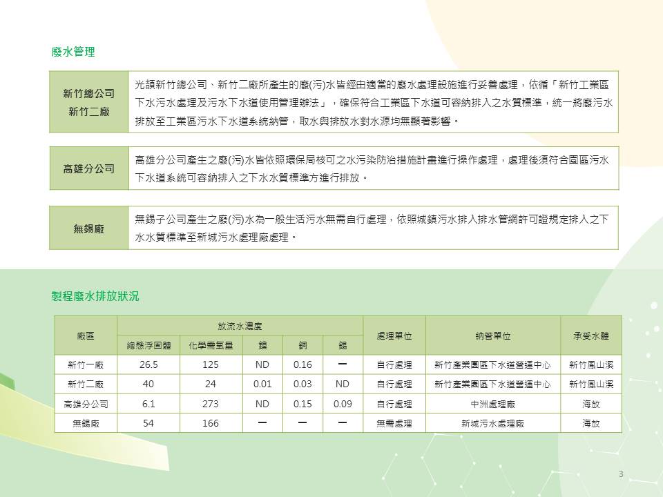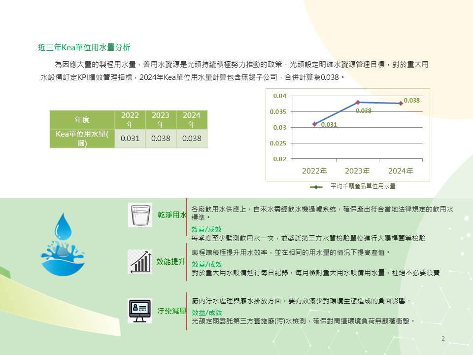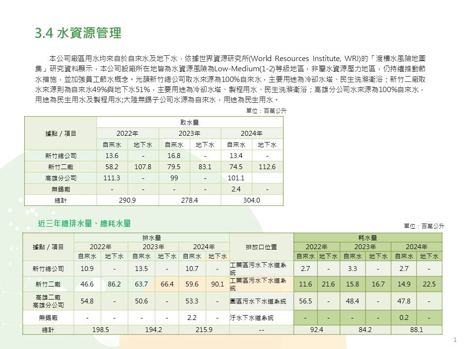 光頡的用水量/廢棄物管理簡介。 光頡科技廣受國內外客戶的支持,不斷的持續成長,並開發符合客戶需求的新產品,積極擴充產能以符合市場需求。日益創新的專業技術和遍佈全球的行銷通路服務客戶。我們的目標是要成為車用產業及高端電子產業關鍵零組件產品的主要合作供應商。 光頡科技於1997年成立, 是薄膜電阻,厚膜電阻 積層電容及電感的專業製造商, 利用薄膜製程的高精密特性及厚膜製程的成本優勢開發生產高精度的SMD精密電阻,MELF柱狀電阻、可打線式、抗腐蝕及薄膜排阻、厚膜排阻、偵測電流低阻、合金超低阻、抗硫化、抗突波、高功率、高電壓,TO220/247 可逹100W, 尺寸齊全01005~2512, 多樣功能選擇,完整電阻產品,擁有最寬廣的阻值範圍、最精密及可靠的製程,成為全球少數電阻精度可達0.01%、 TCR 2ppm/℃的製造商。